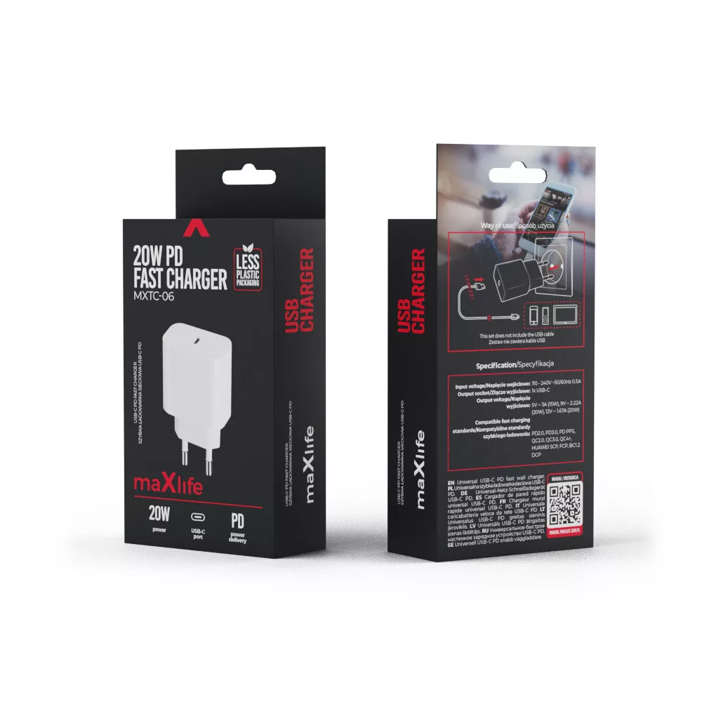 Hálózati adapter - 20W - USB-C - fehér - Maxlife MXTC-06 PD QC