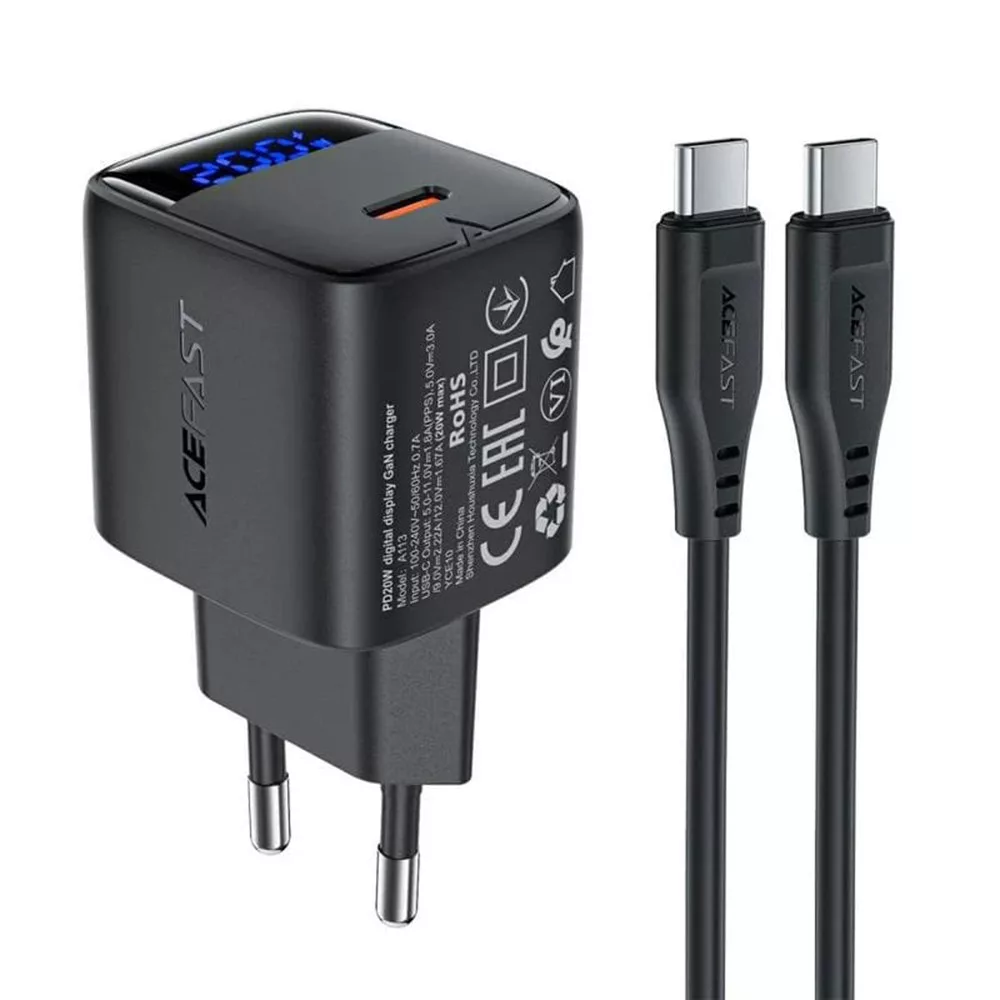 Hálózati töltő - 20W - USB-C + Type-c - fekete - Acefast